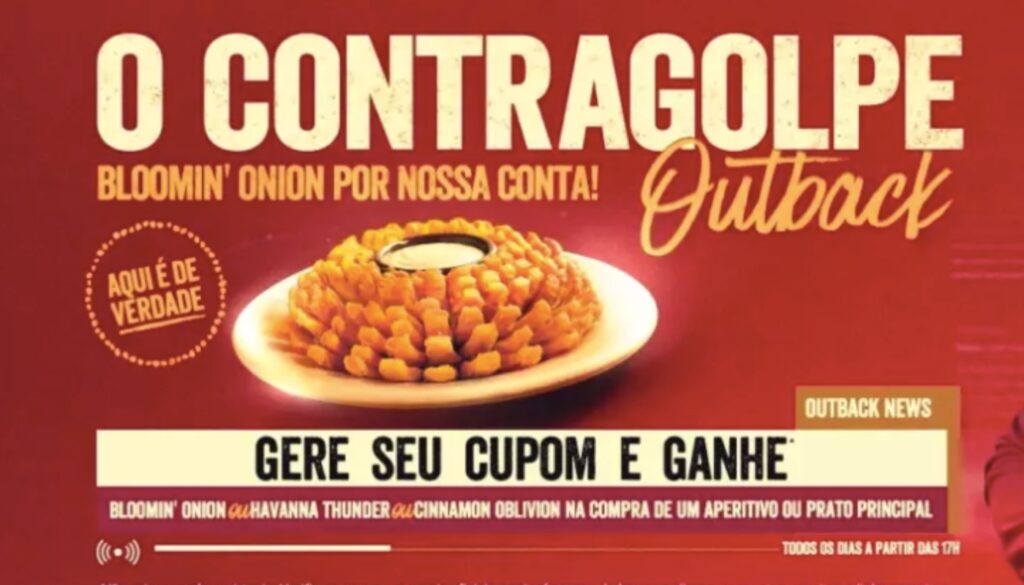 “A gente sabe que tá cheio de golpe na internet, mas aqui no Outback é tudo de verdade”, diz uma postagem do restaurante nas redes sociais oficiais da marca. Para ganhar a famosa “cebola do Outback” – ou uma entre duas sobremesas, a Havanna Thunder ou a Cinnamon Oblivion –, basta entrar no site oficial do Outback e gerar um cupom.
