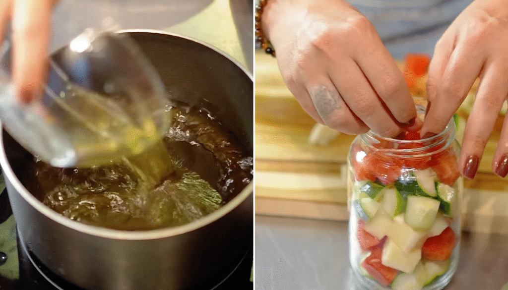 Corte os demais ingredientes em cubos, mas lembre-se de retirar o excesso de sementes da melancia e do pepino. Coloque os cubos em um vidro esterilizado, cubra com o líquido e leve para a geladeira.