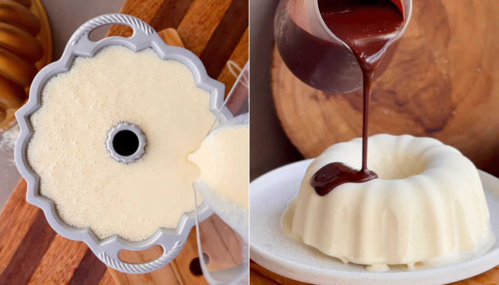Por fim, na hora de servir, coloque a forma por 15 segundos em um recipiente com água em temperatura ambiente, desenforme e despeje a cobertura.