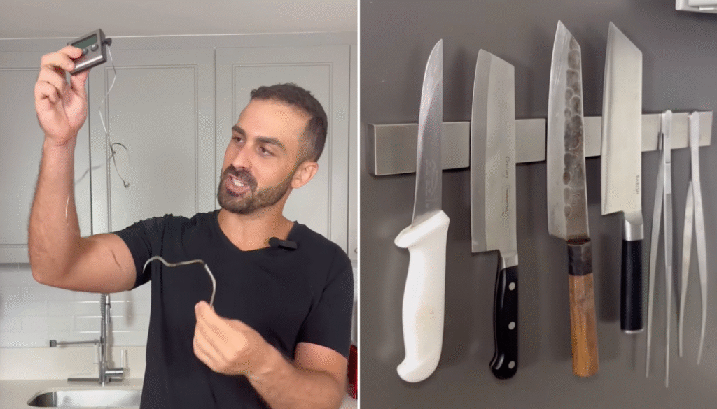 Guardar as facas separadamente ajuda a manter o corte das facas. Por isso, um suporte magnético é essencial. Na internet, há opções desde R$ 18 a mais de R$ 100.